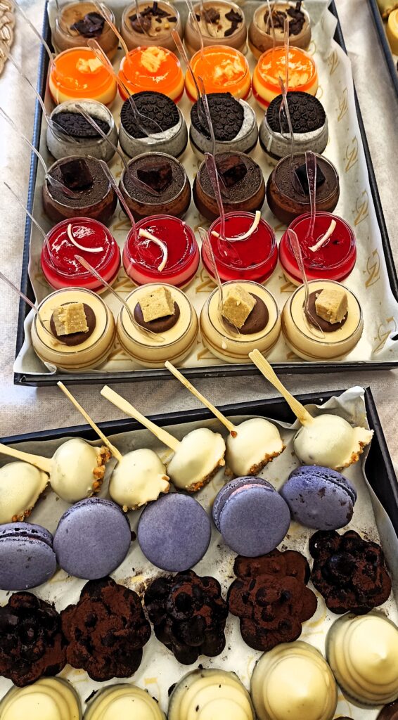 אני עם מגש צבעוני של קינוחי נוגטין בצורת פרח