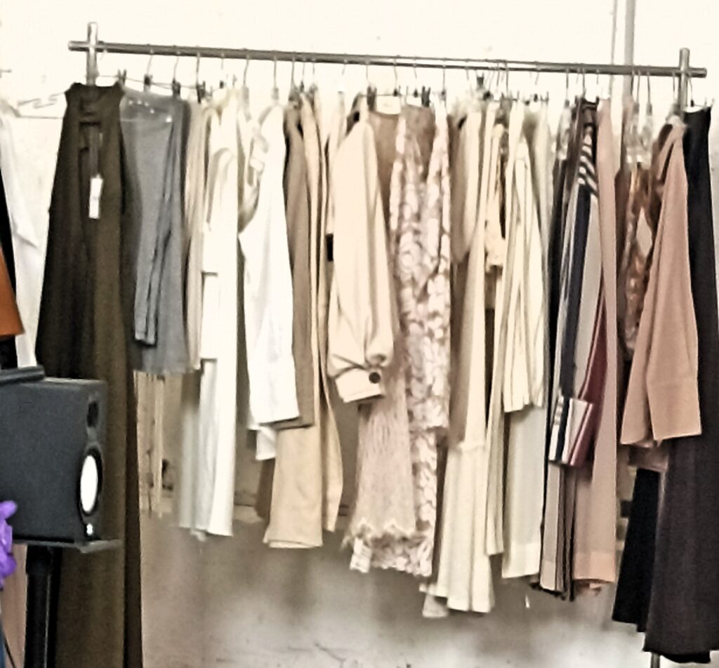ואז הגיע תור הבגדים התלויים על קולבים, בצבעוניות מונוכרומטית, רגועה ועם זאת עכשווית מאוד, שבדיקה מקרוב הראתה כמה מוקפדים בהם כל תפר, חגורה וצווארון.