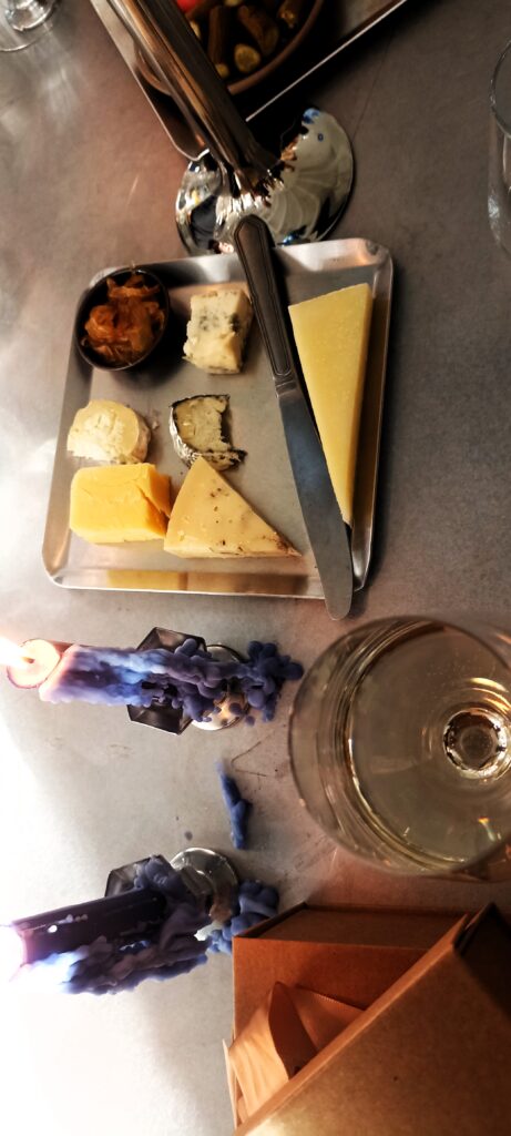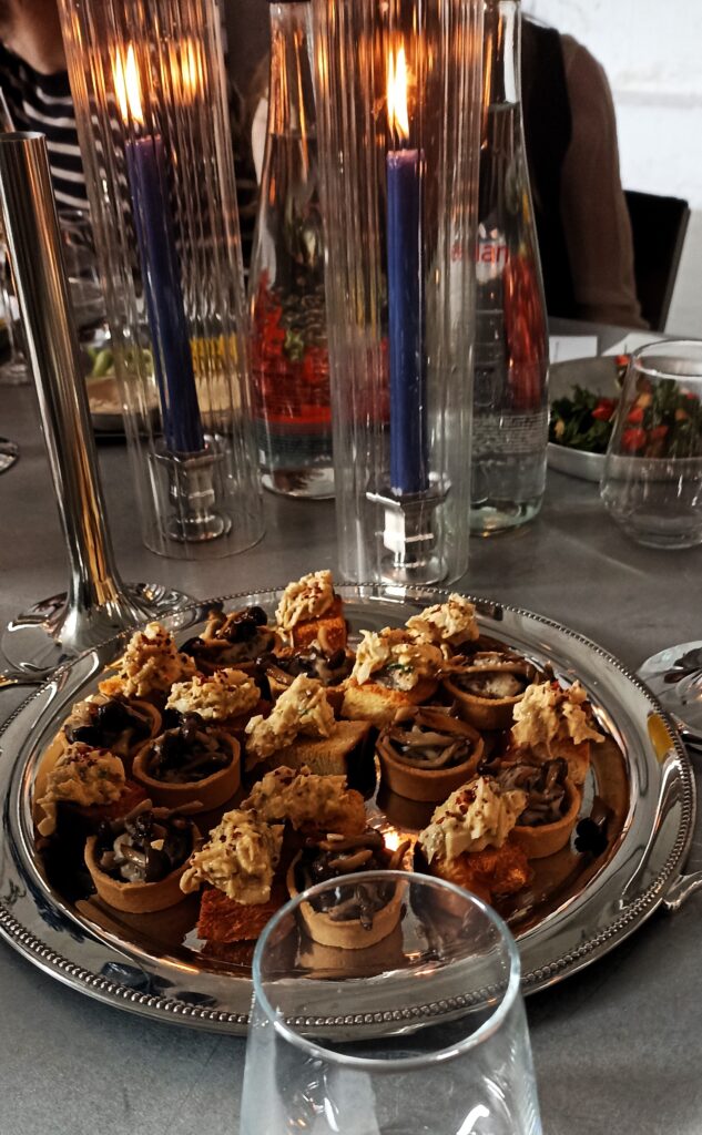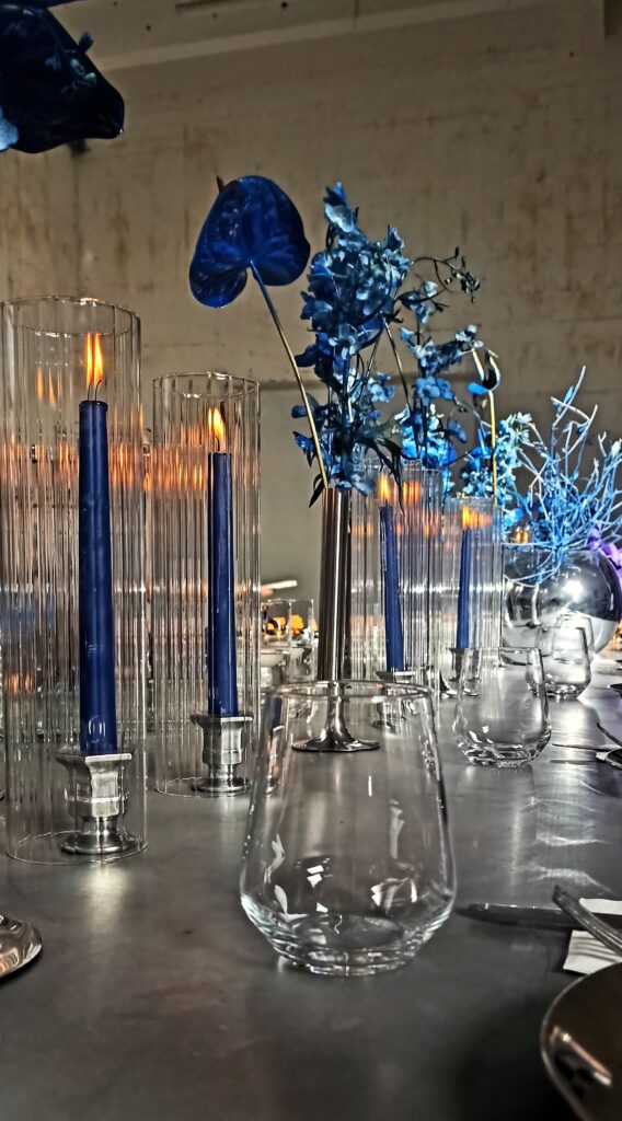 ההתכנסות הייתה באולם ענק עם קירות בטון חשוף וסדוק, מזכיר האנגר, לופט ניו-יורקי או בית מלאכה לשעבר. שולחן ארוך בגוון אלומיניום, אגרטלים גבוהים, צרים ושקופים ובהם פרחים כחולים, נרות מהבהבים, וגם כיבוד מסוגנן, כל אלה פגשו אותנו מהצעד הראשון, ומחלקם תתרשמו בצילומיי המצורפים.