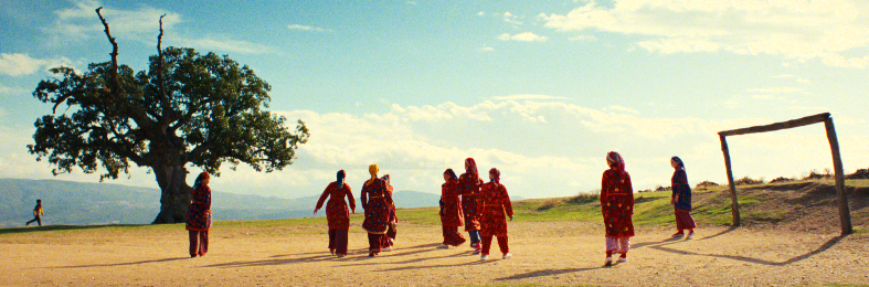 בצילומים: אחמט ואחיו הקטן. בנות הכפר נאספות למשחק כדורגל עצמאי לבושות בשמלות מסורתיות. הנערה שאחמט מתאהב בה.